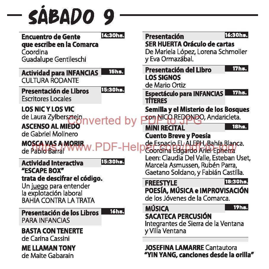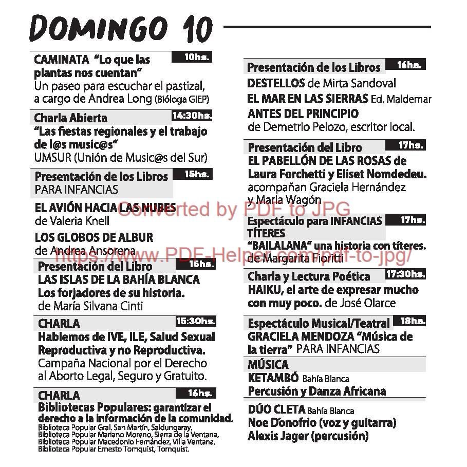 Todo esto y mucho más encontrarás en la 14° FERIA DEL LIBRO Y LA CULTURA DE SIERRA DE LA VENTANA, que inicia el viernes 08 de noviembre a las 09 hs y continúa abierto al público hasta la 22hs, con actividades para escuelas hasta las 16:30hs Sábado y domingo la Feria recibe a sus visitantes entre las 10hs y las 22 hs.