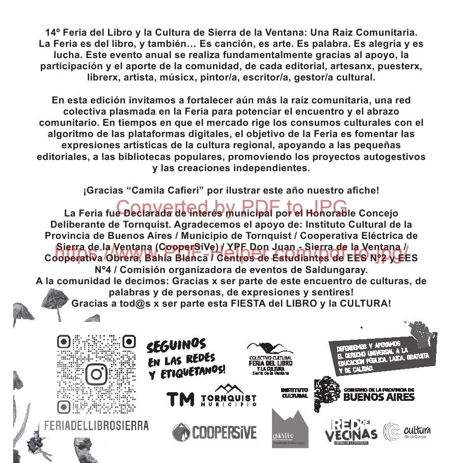 Declarada de interés municipal por el Honorable Concejo Deliberante de Tornquist, la 14º edición de la Feria del Libro y la Cultura de Sierra de la Ventana invita a dejarse enredar por este crisol de identidades donde cada voz suma. Hacer, de esta raíz comunitaria, una red colectiva que estará plasmada en la Feria para potenciar el encuentro y el abrazo comunitario.